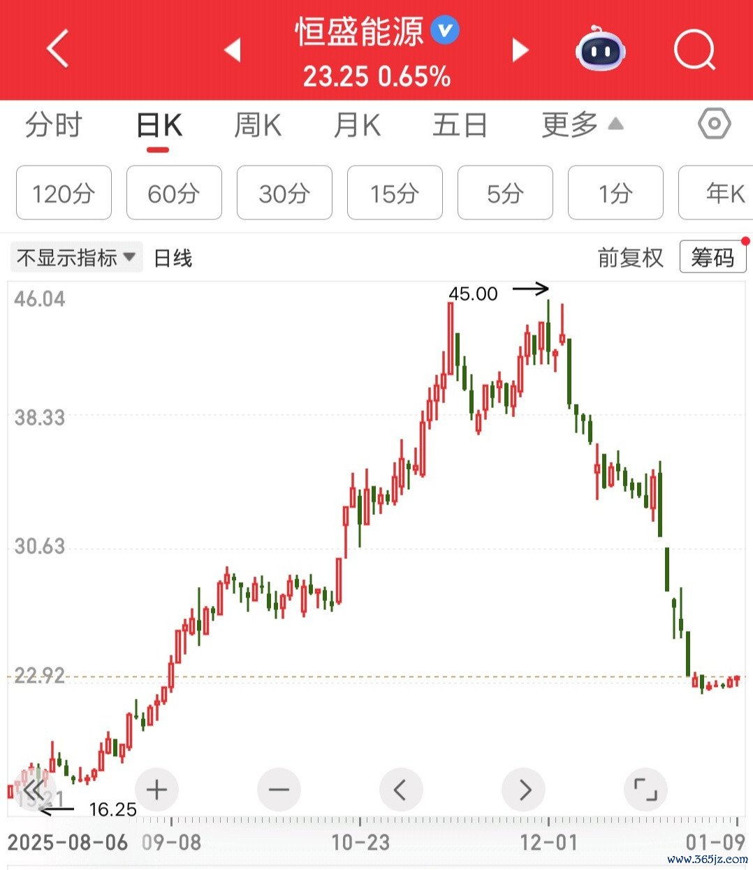 电力板块还有一只票,叫恒盛能源。25个交易日,跌幅近50%,腰斩走势。光看这图形,就让人脊背发凉。