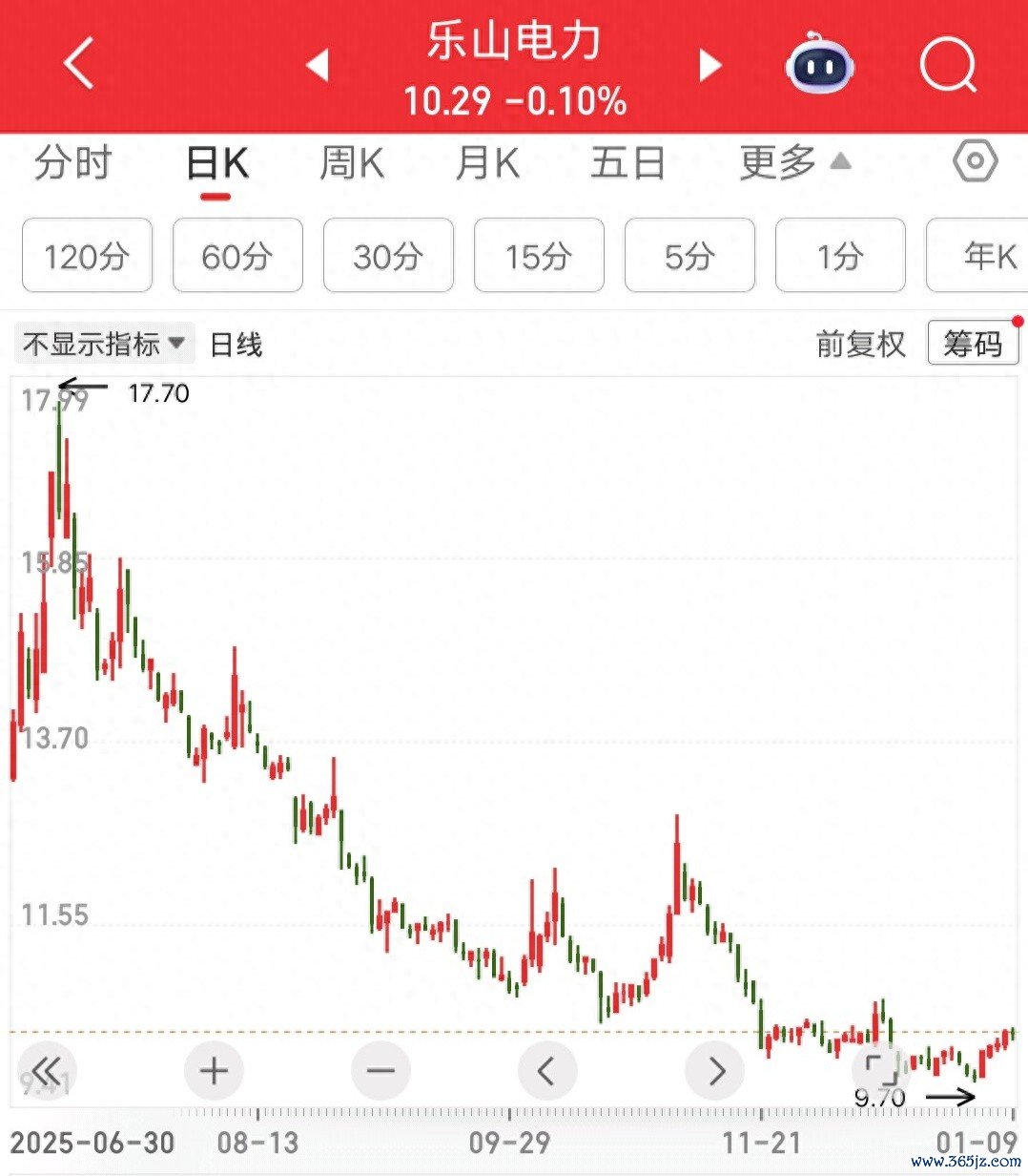 至于为什么跌这么多,就是因为有过大幅上涨。还记得去年四月的那波股灾吗,企稳以后电力受到市场关注。乐山电力三个月涨了1.5倍,够牛了吧。在此票上吃过大肉的股友,现在怎么样了,是利润还回去了,还是账户继续新高呢。