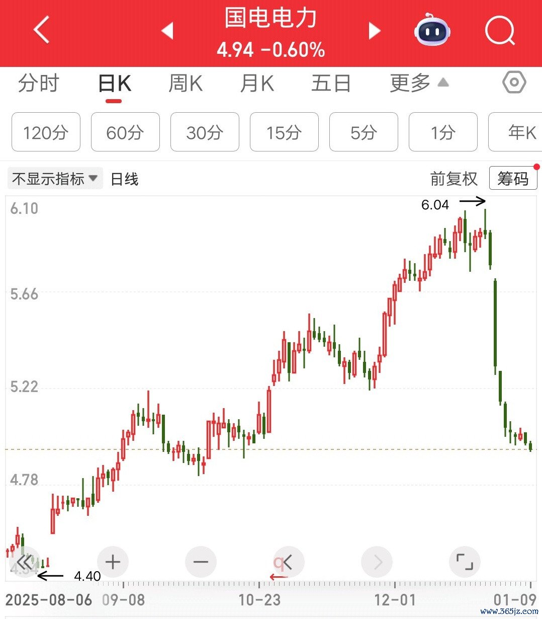 还没完,国电电力也挺惨的。9个交易日,跌幅超过16%,又是主跌浪。犹豫不决的人,肯定被套了。