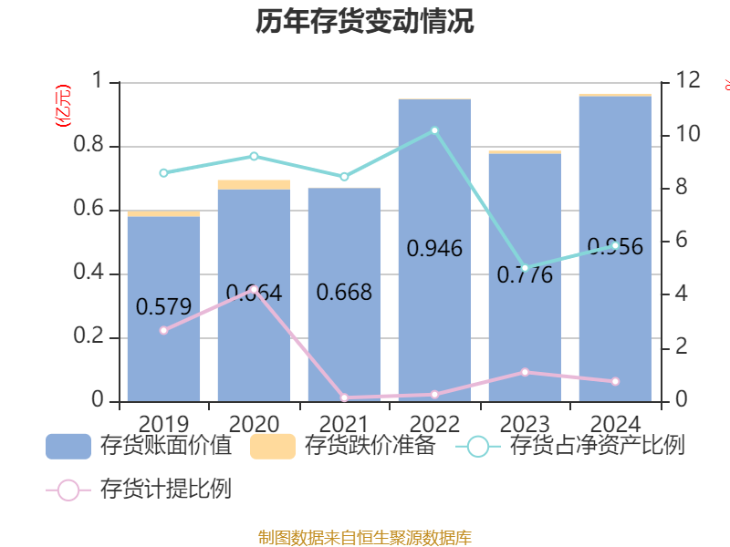 从存货变动来看,截至2024年末,公司存货账面价值为9558.42万元,占净资产的5.85%,较上年末增加1795.79万元。其中,存货跌价准备为71.15万元,计提比例为0.74%。