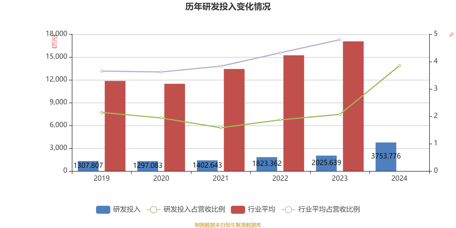 2024年全年宏盈国际,公司研发投入金额为3753.78万元,同比增长85.31%;研发投入占营业收入比例为3.85%,相比上年同期上升1.78个百分点。此外,公司全年研发投入资本化率为0%。