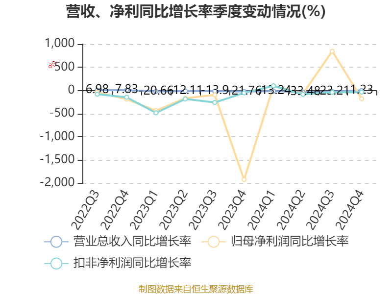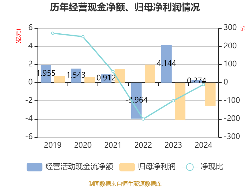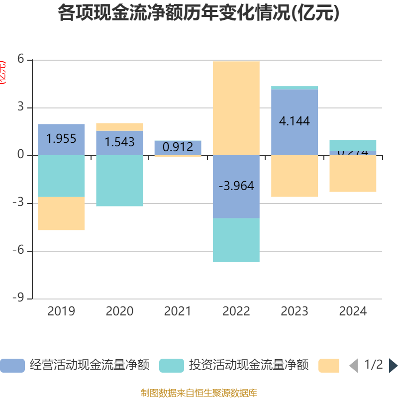 截至2024年,公司经营活动现金流净额为2736.01万元,同比下降93.4%;筹资活动现金流净额-2.3亿元,同比增加3118.18万元;投资活动现金流净额6915.16万元,上年同期为1952.36万元。