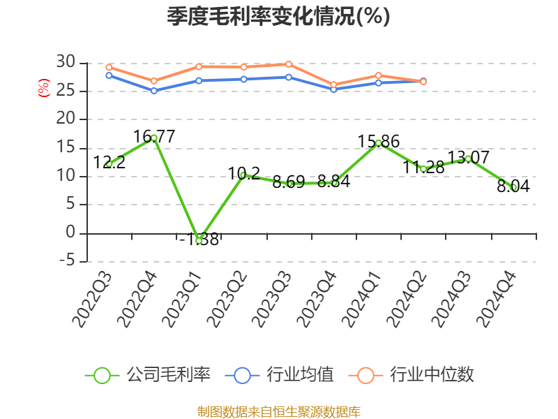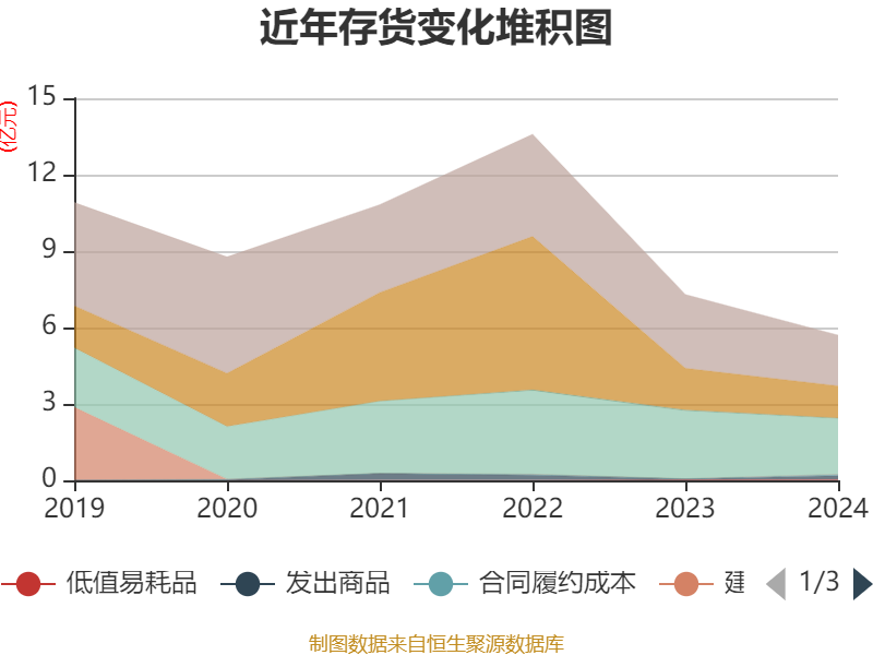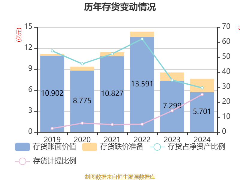 从存货变动来看,截至2024年末,公司存货账面价值为5.7亿元,占净资产的29.45%,较上年末减少1.6亿元。其中,存货跌价准备为1.9亿元,计提比例为25.04%。
