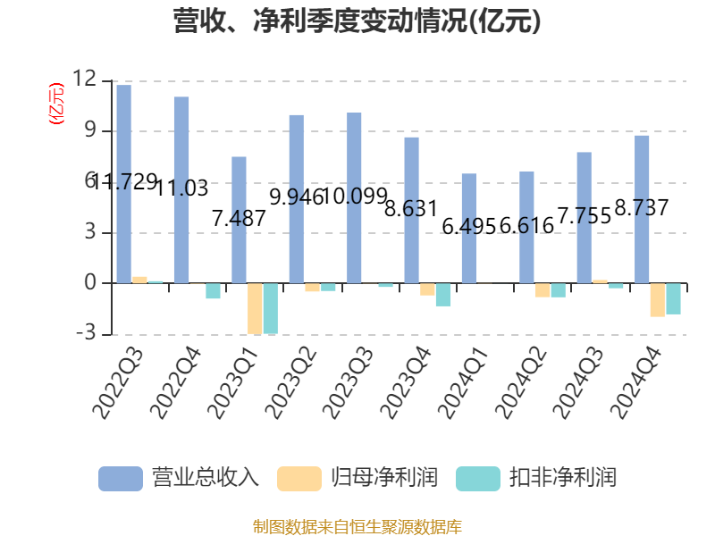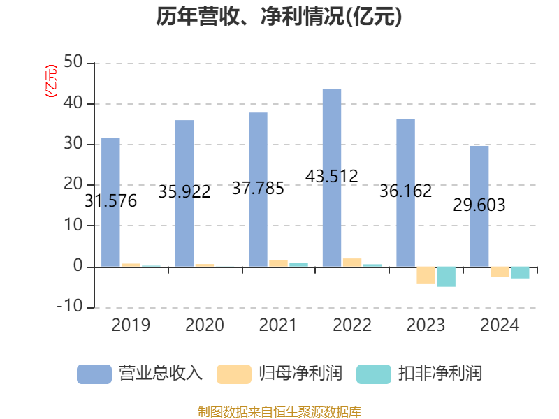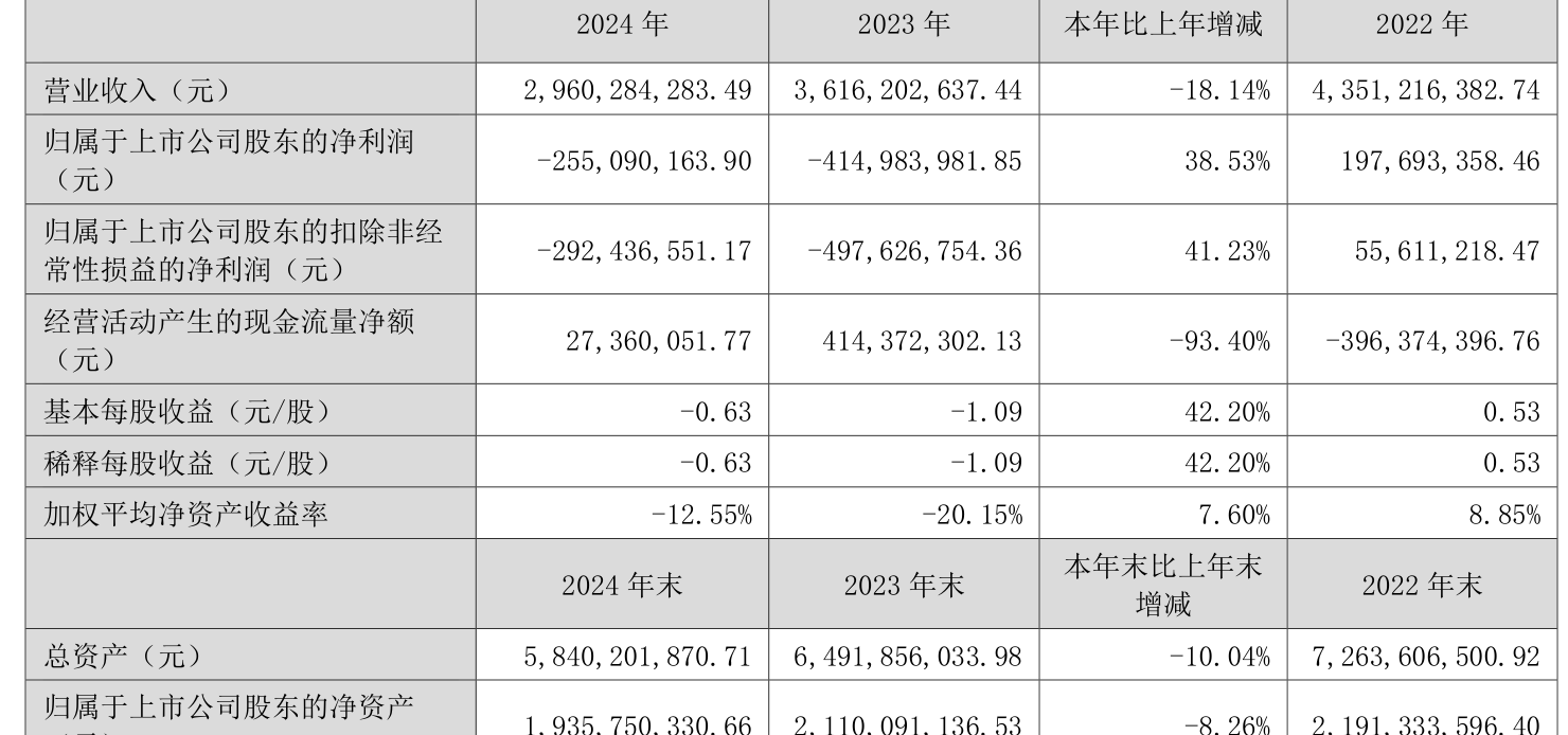 中证智能财讯天奇股份(002009)4月25日披露2024年年度报告。2024年,公司实现营业总收入29.60亿元,同比下降18.14%;归母净利润亏损2.55亿元,上年同期亏损4.15亿元;扣非净利润亏损2.92亿元,上年同期亏损4.98亿元;经营活动产生的现金流量净额为2736.01万元,同比下降93.40%;报告期内,天奇股份基本每股收益为-0.63元,加权平均净资产收益率为-12.55%。